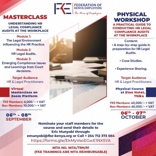 The Federation of Kenya Employers (FKE) has organized a Hybrid Course on Understanding HR Legal Compliance Audits at the Workplace. This course will give employers an opportunity to assess what their organization is doing right, as well as how things could be done differently, more efficiently or at reduced costs.